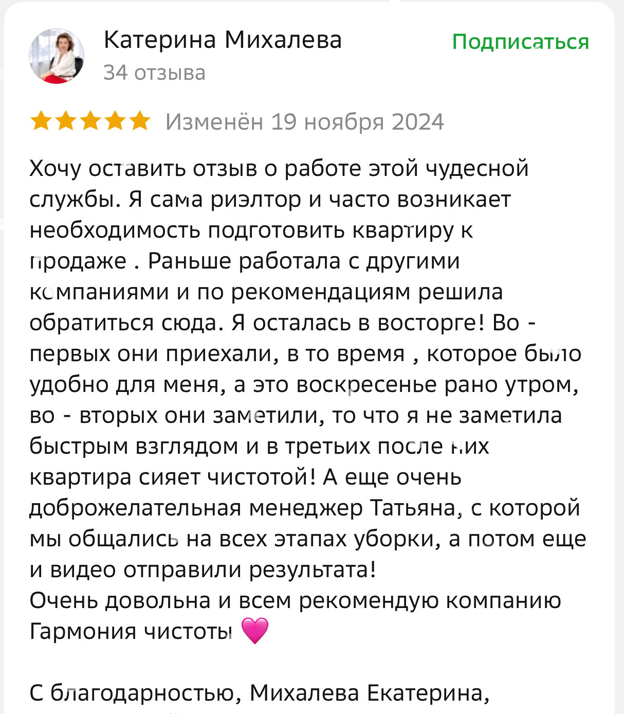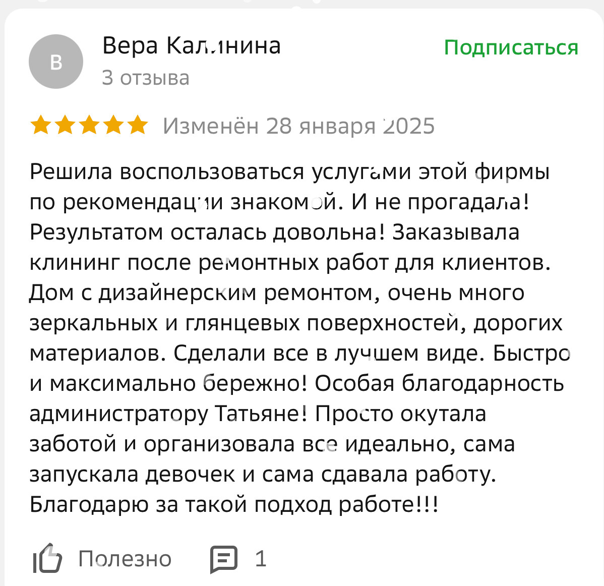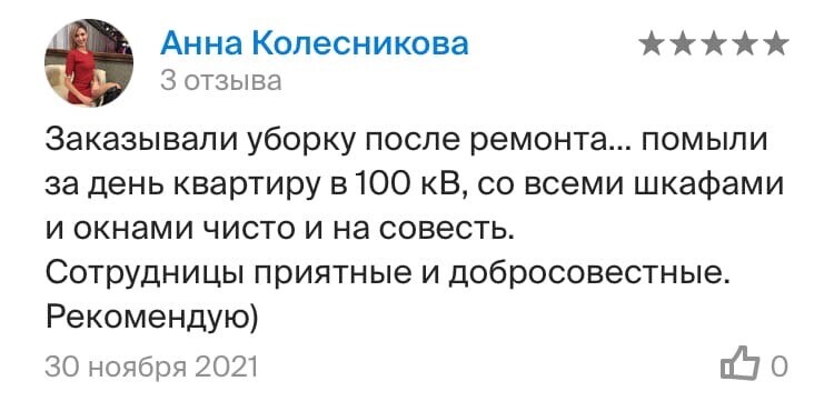 | Для постоянных клиентов действует система скидок Надбавка за сложность до +30% (если есть сложные загрязнения, шерсть домашних животных, много глянцевых/зеркальных поверхностей и предметов интерьера) При заказе уборки в отдалённые районы и за пределы города, учитываются транспортные расходы | |